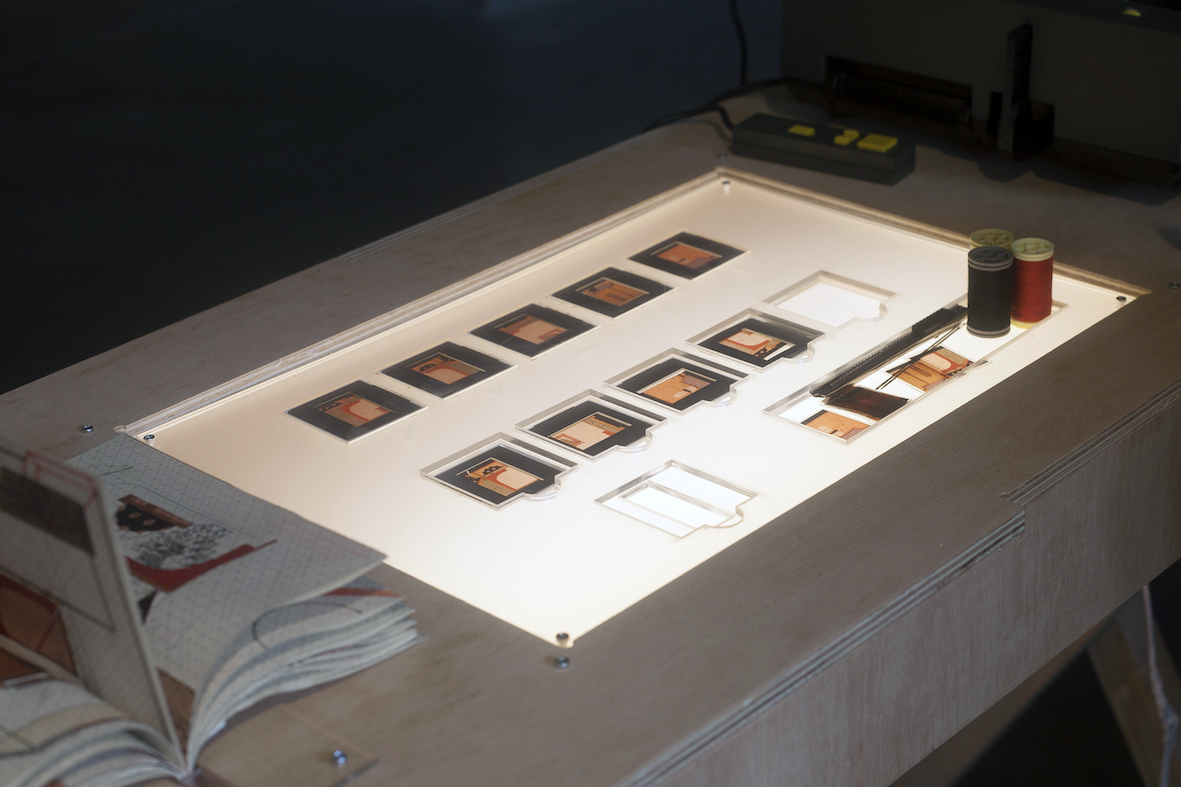 [Photograph by Bahar Avanoğlu. Reading Table: Making of a Palimpsest, Burying a Book into Another after the Archimedes Palimpsest as a part of DrawingConstructions. ]